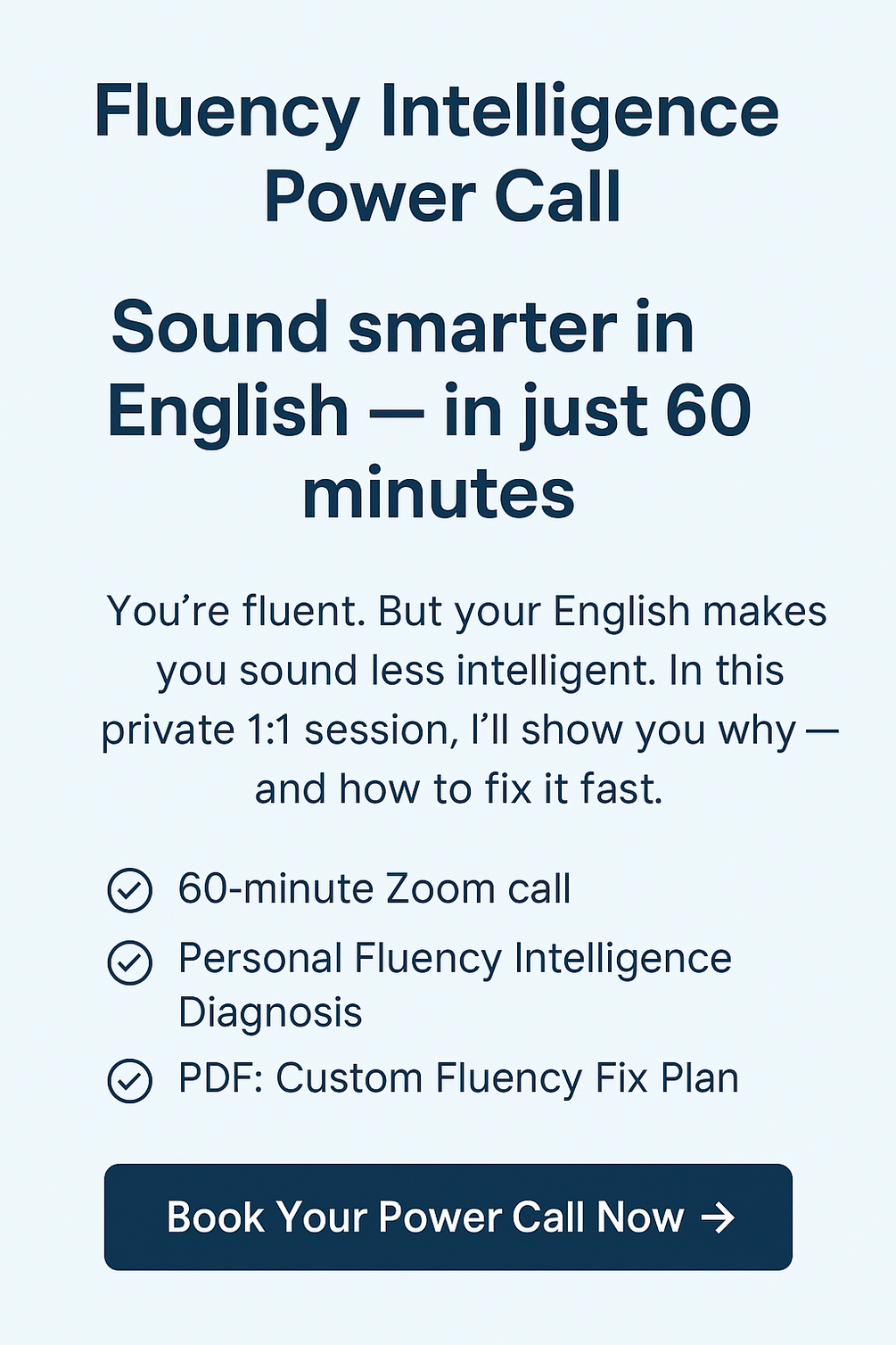 Book your Fluency Intelligence Power Call now and unlock the confident, articulate speaker inside you.